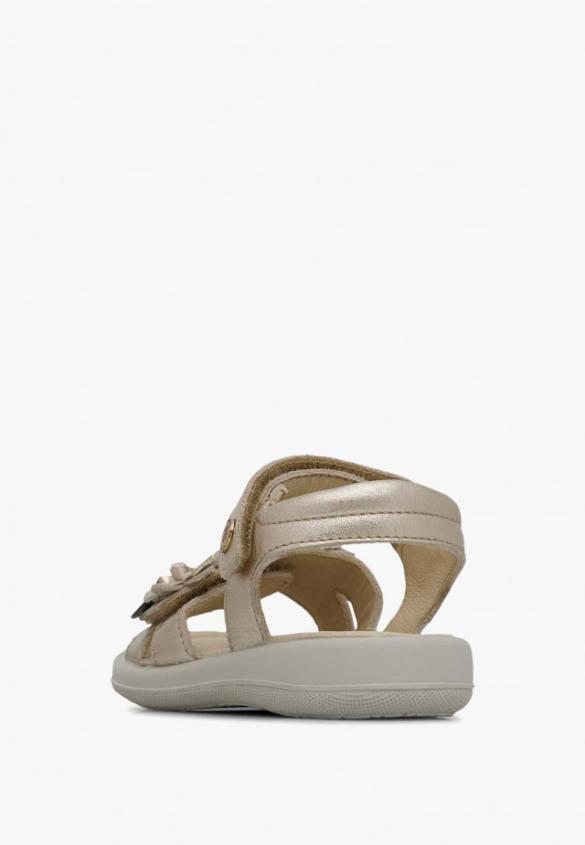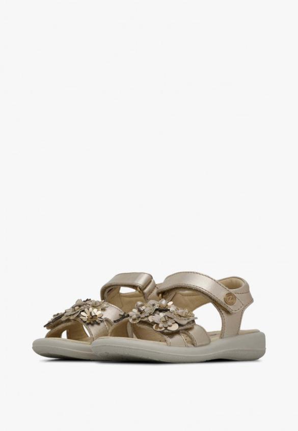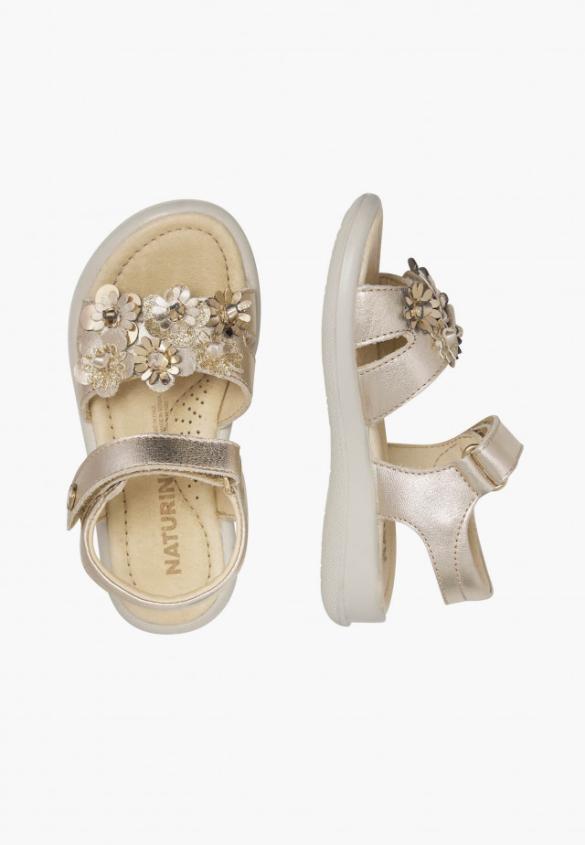 Summer sandal with metallic calfskin upper and double strap closure. The strap over the toes is decorated with on-tone flower appliqué. The model is completed with leather lining and insole, rubber sole with custom design.Product Name: NATURINO BRAHMA