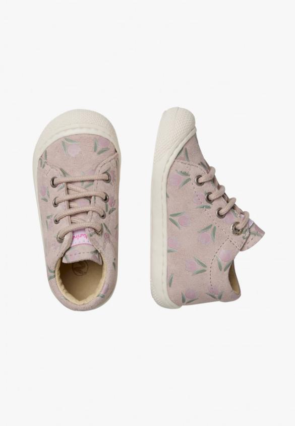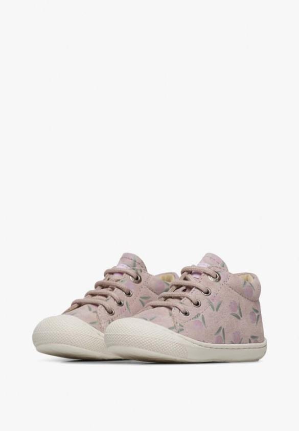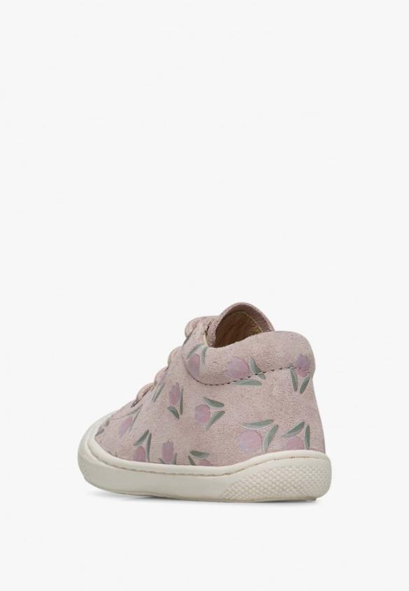 First steps shoes with a structured line, with suede upper decorated with a tulip print. The raised heel with padded opening is accompanied by an inner leather lining, lace closure and non-slip rubber sole with reinforced toeProduct Name: NATURINO COCOON