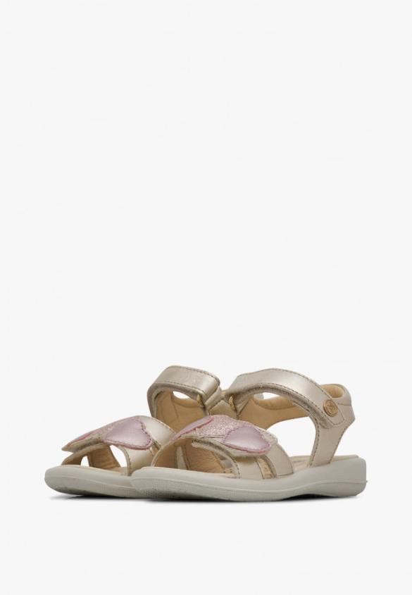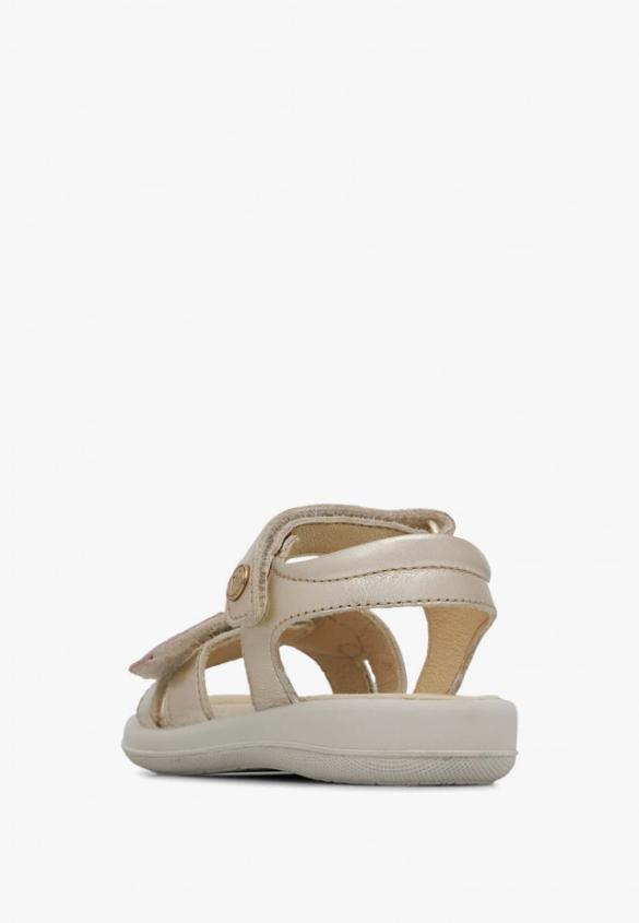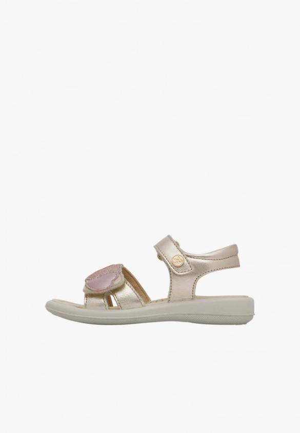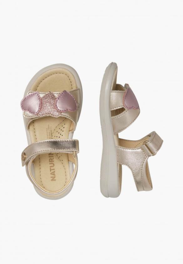 Summer sandal with metallic leather upper. The construction features a band with strap over the toes, decorated with two hearts in contrasting colour and one in a glittery finish. Leather lining and insole, adjustable strap at the ankle and rubber sole.Product Name: NATURINO NIVES